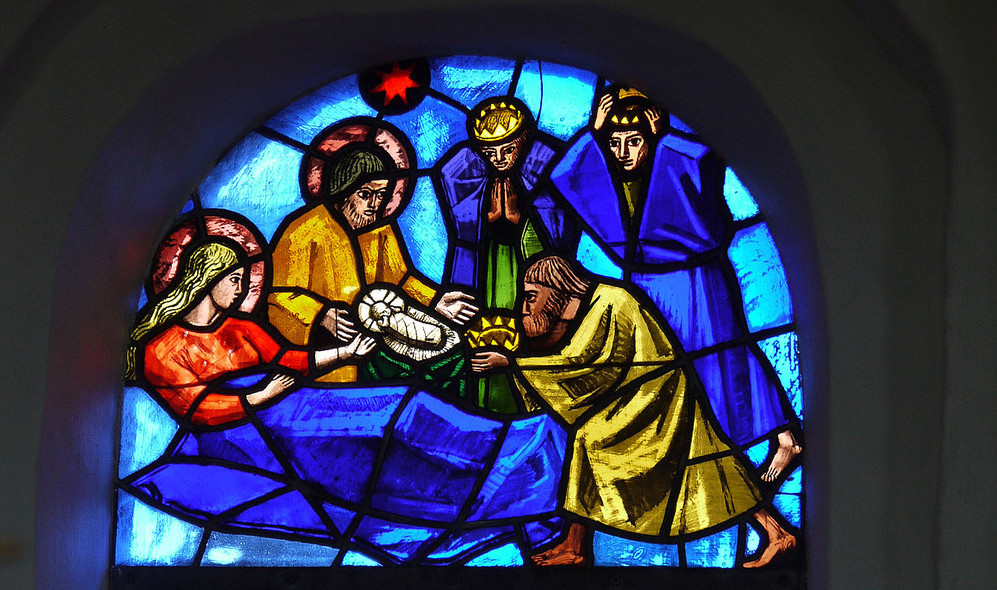Find værker til kirkeårets højtider. Her Johan Thomas Skovgaards glasmosaik med julemotiv fra Kregme Kirke.