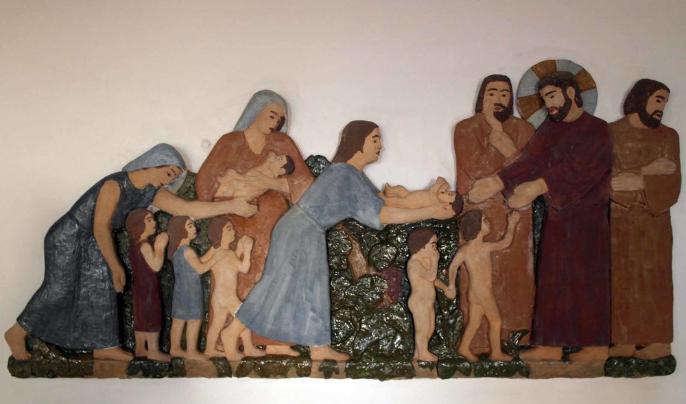 Find værker med en bibeltekst som motiv. Her er det Gunnar Hansens relief fra 1957, Lad de små børn komme til mig.